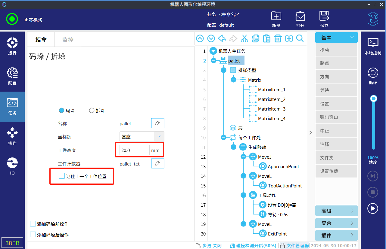 码垛支持用户自定义排样类型、层数、参考点等,进行码垛和拆垛任务的编写。