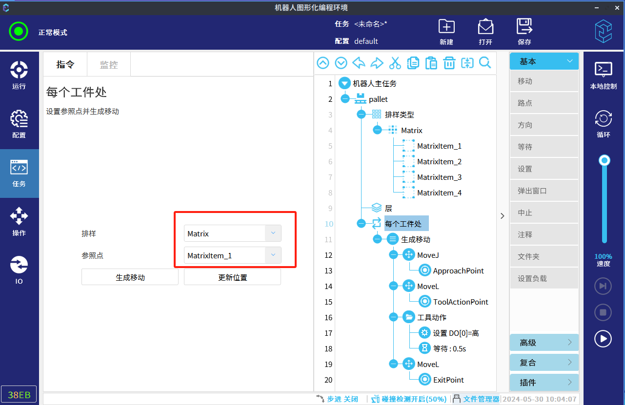在“生成移动”节点下,设置接近点、工具动作点、工具动作以及离开点。设置完成后,工具将对每个工件重复这些动作。