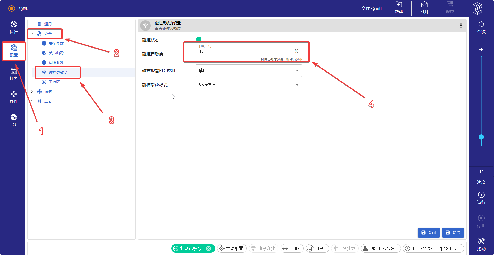 点击配置——安全——碰撞灵敏度——点击参数窗口即可修改(范围10-100)