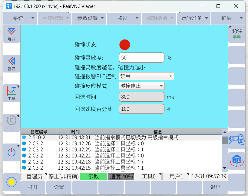6. 设置碰撞检测灵敏度,运行准备—安装配置—碰撞检测,如碰撞状态是红色,可点击左下角“打开“启动碰撞功能。