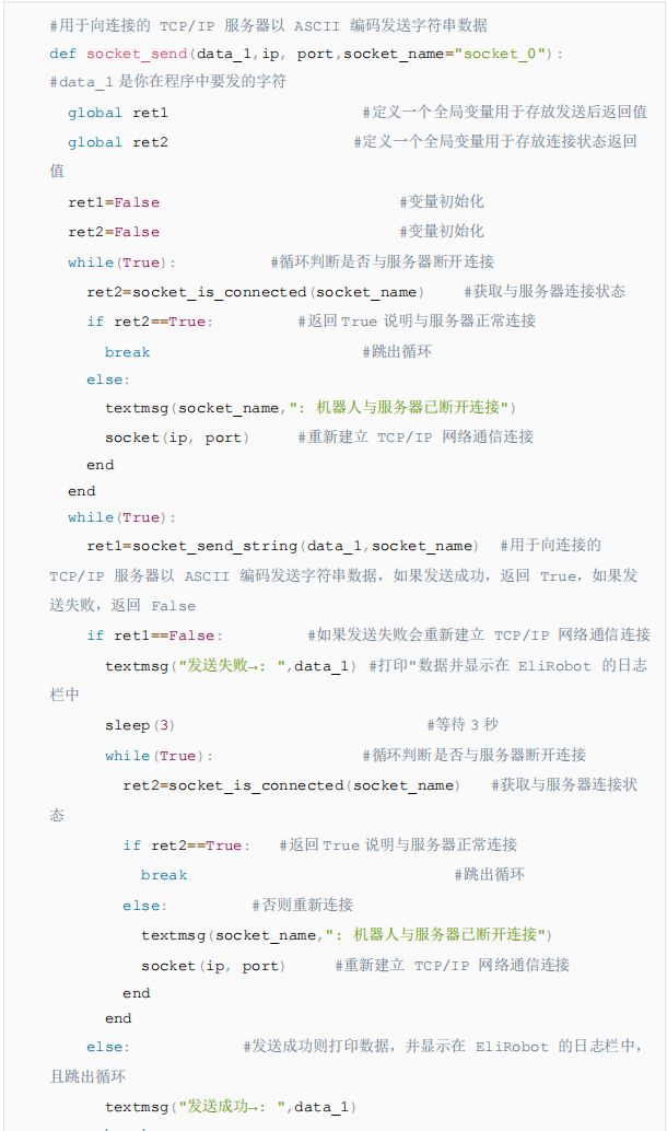 - 以上代码是以发送字符串和读取字符串为例,如果想发送/读取其他数据类型,只需要更换代码中的socket_send_string/socket_read_string即可,具体指令参考CS机器人脚本手册下载中心_机器人技术-米兰·(milan)中国机器人
