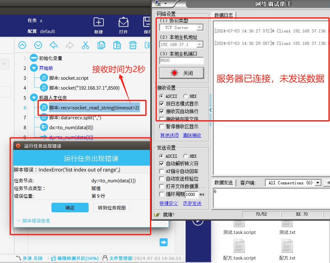 b:如果我们机器人客户端未接收到数据程序依然会往下继续运行,这样就会影响我们的程序流程,如图3-2所示(未接收到数据,程序依然往下运行,当运行到索引字符串转换时没有数据程序就会报错,这时程序已经停止需要重新初始化程序)。