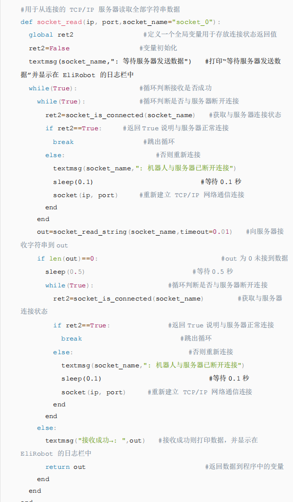 2.为了避免以上a.b两种情况发生,我们可以在接收数据之前通过“socket_is_connected()”判断与服务器连接的状态如果断开重新连接,并通过再次接收接收指令例如“socket_read_string(timeout=2)”的返回值判断是否接收到数据,返回值为0时,再次接收数据,如图3-3所示,以用下面代码3-1配合图3-3的图形化编程直接调用df脚本实现此操作。