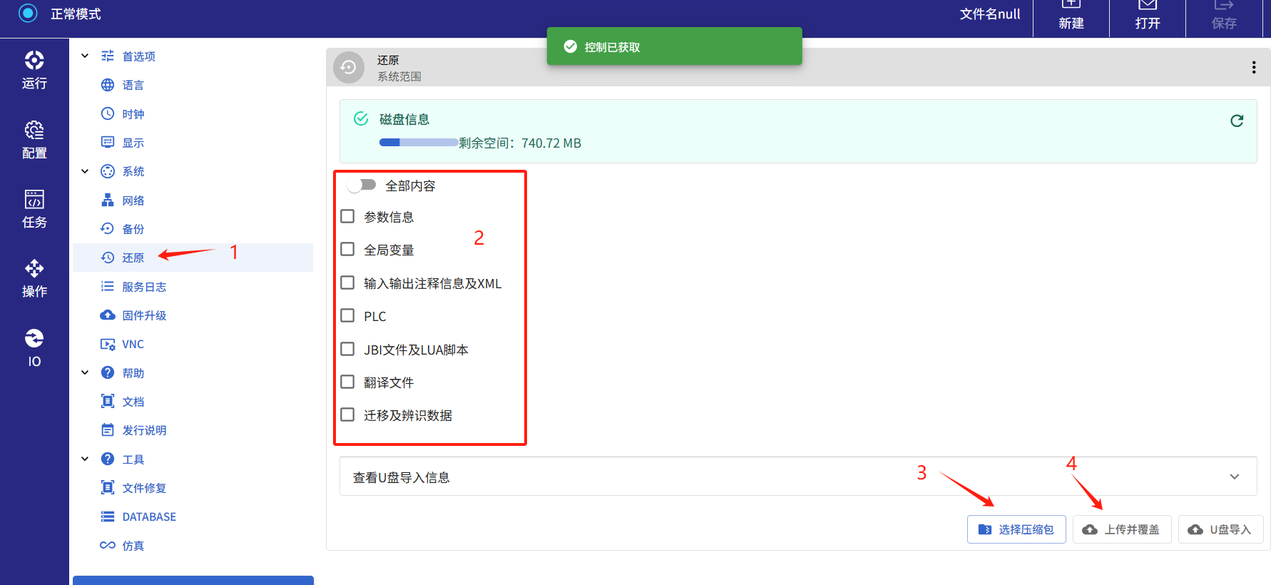 ● 恢复:点击右上角“上传文件”,按照弹窗提示选择需要导入的文件进行上传。