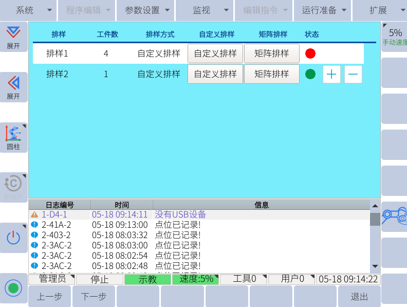 1. 进入管理员模式,选择运行准备-----8. 工艺配置-----勾选码垛,点击左下角的设置,重启后,在右上角的扩展里面会有码垛工艺配置。