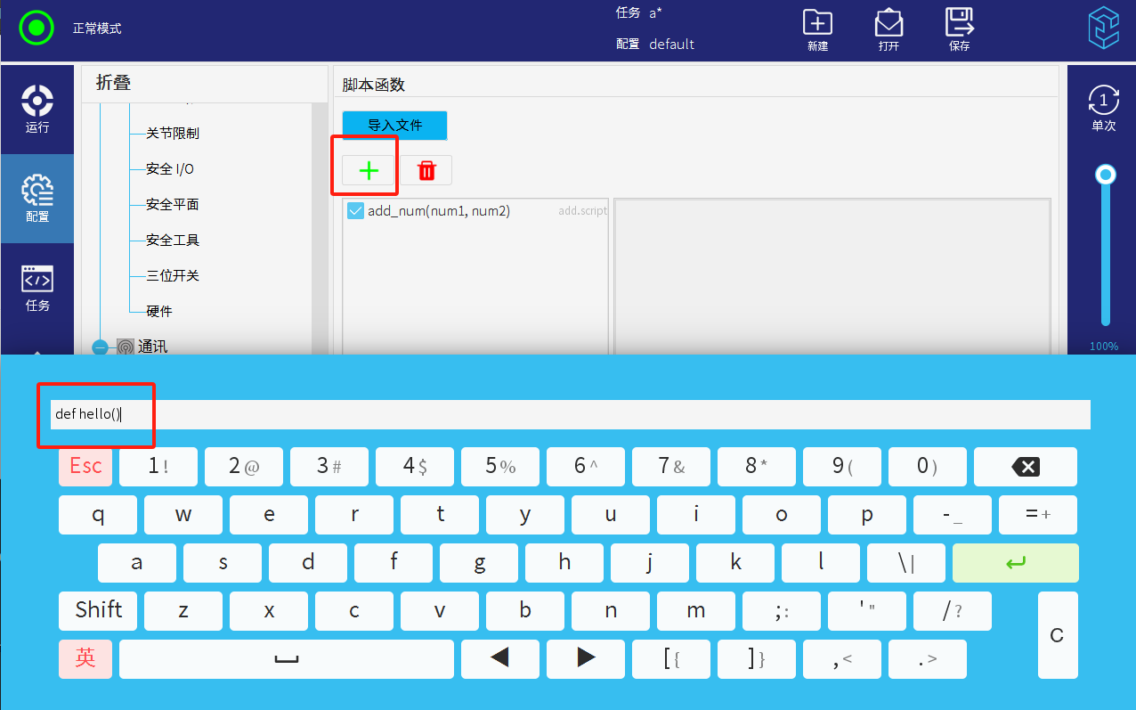 点击添加按钮,在键盘中输入函数的签名,只支持添加函数签名并可以添加到键盘函数中,函数体需要在任务树的脚本中补全。