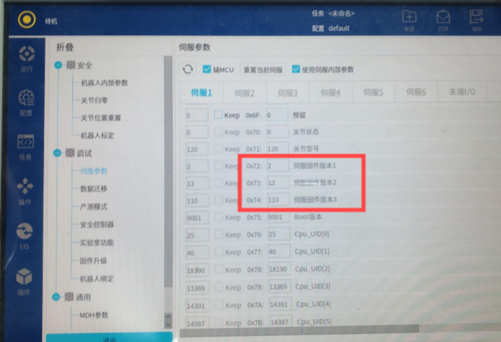 (4)下拉至”72,73,74列”,如伺服版本皆为“0”,则伺服固件异常。下图为辅MCU正常时的版本数据。