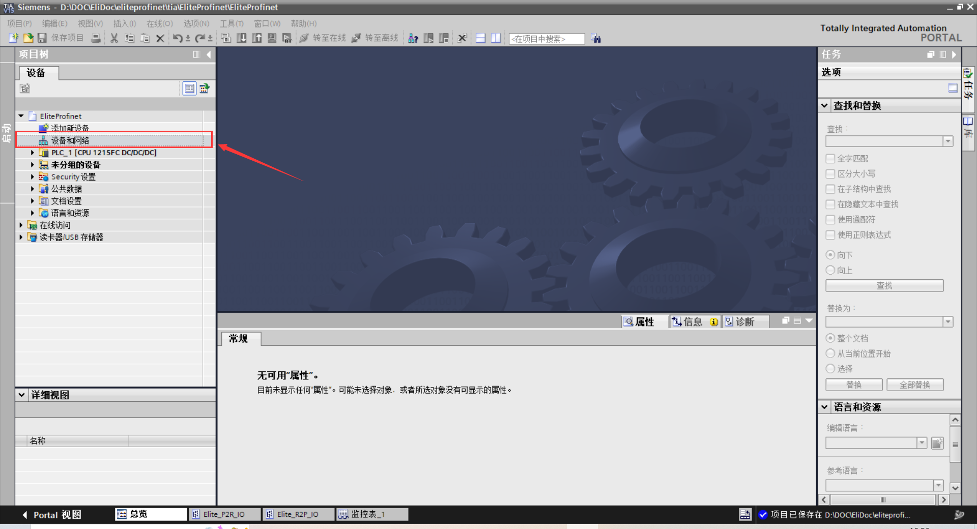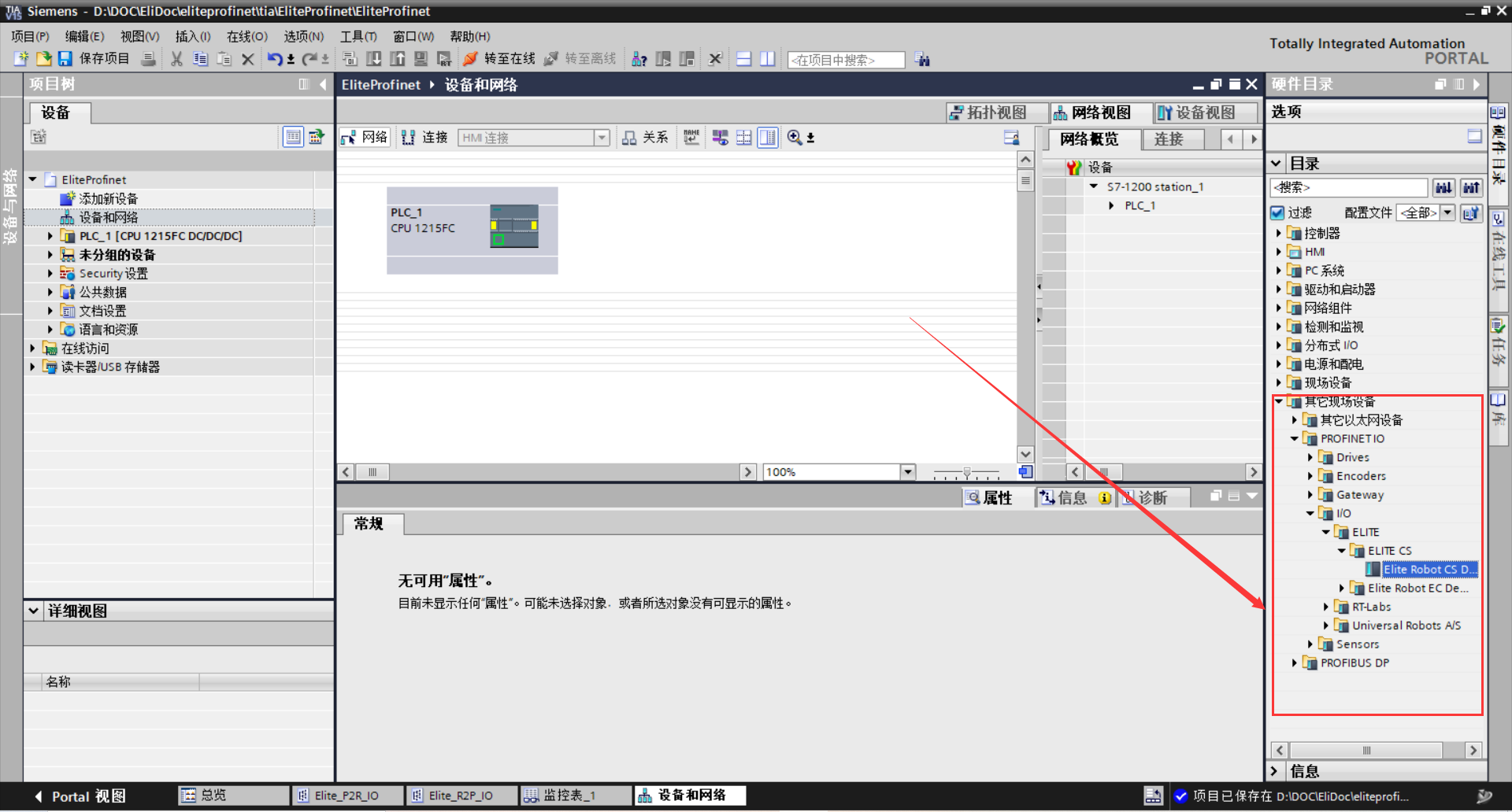 1)双击左侧项目树中的“设备和网络”,如图 3-2(a)所示;双击或拖拽右侧硬件目录 中,具体路径为:“其他现场设备> PROFINET IO> IO> ELITE> ELITE CS> Elite Robot CS Device”,如图 3-2(b)所示。