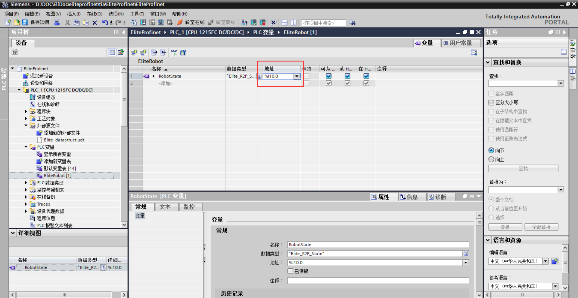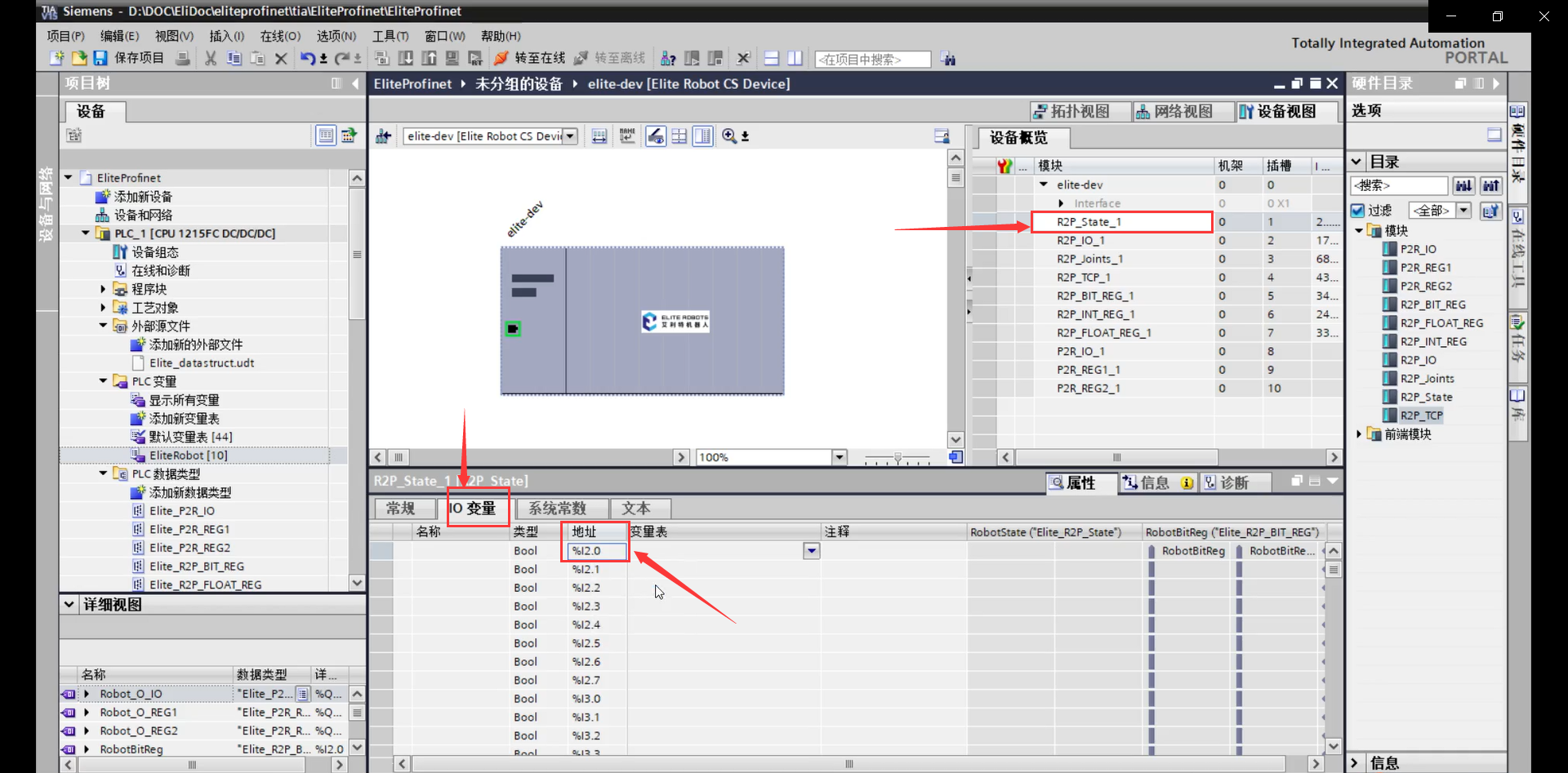 2)左侧项目树中双击“设备和网络”并双击“elite-dev”选择插槽 1 中“R2P_State_1”, 选择“IO 变量”,记下第一个变量的地址,如图 3-8(b)所示,是“%I10.0”。 3)回到变量表中,将刚刚记录下的地址填入变量地址,如图 3-8(c)所示。以此类推,可 以将十个插槽中的变量添加。