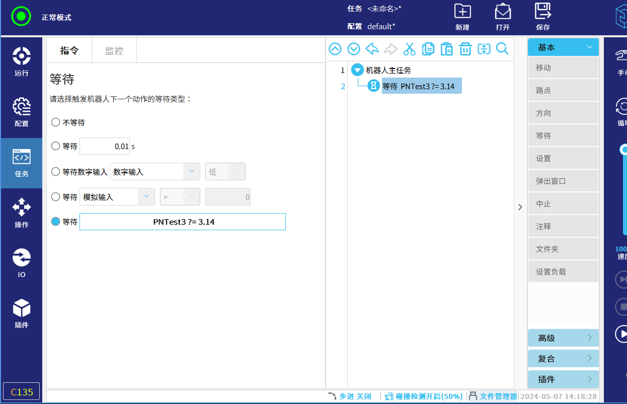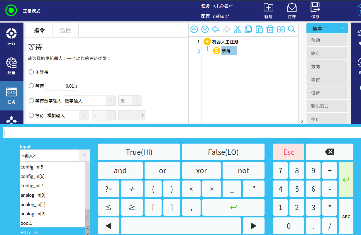 若要等待浮点寄存器或者整数寄存器为指定数值则需使用函数,如下图选择等待,下拉input快捷栏找到定义好的浮点/整数寄存器: