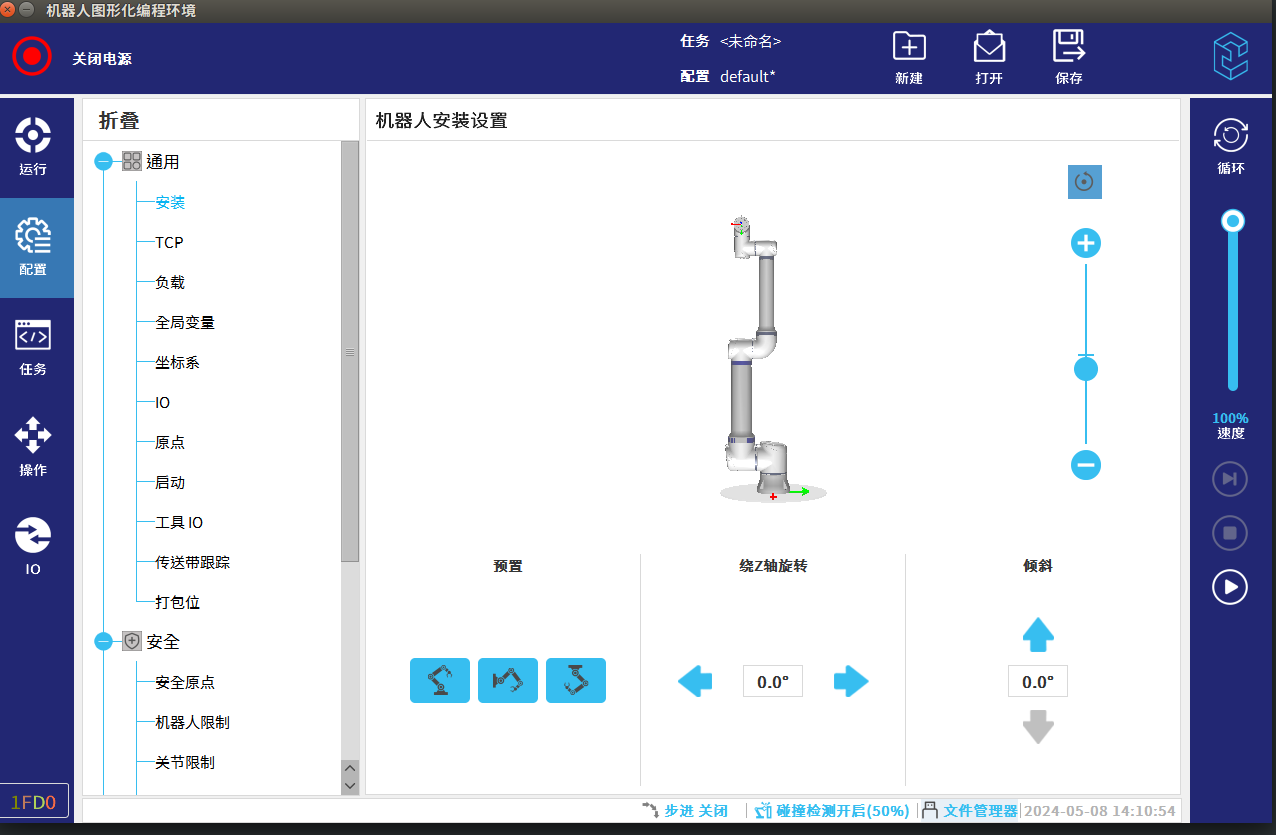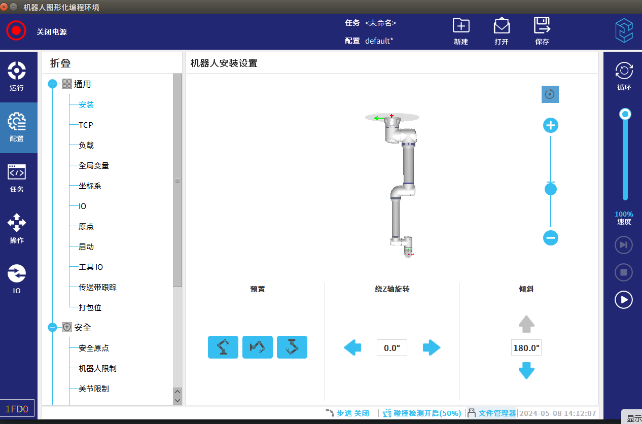 在CS机器人中有很多常用参数需要我们去进行配置,比如安装方式,IP地址的设置,新建TCP,负载的设定,全局变量的设置,坐标系的建立,原点的设定,启动的设定,如何回打包位等等一些常用参数的配置。