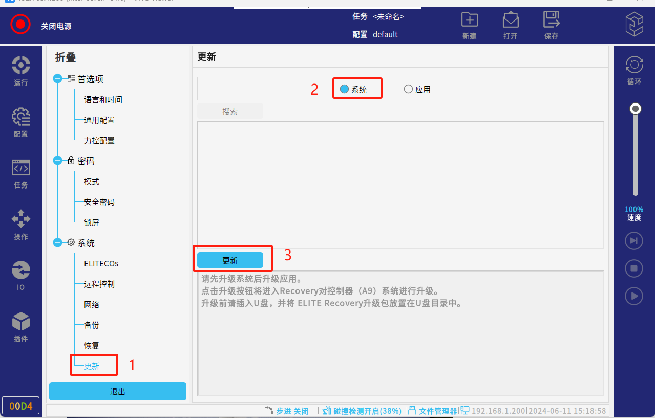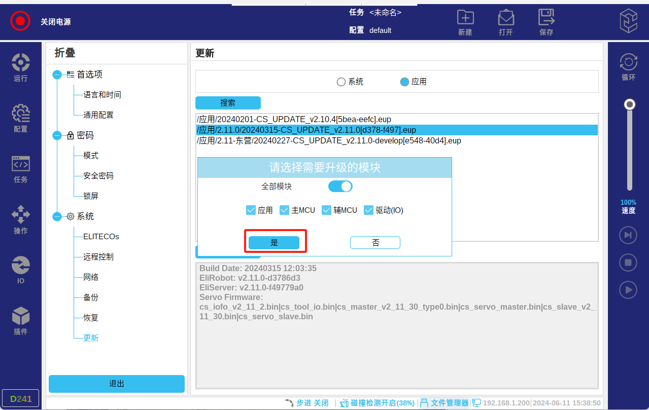 调试阶段建议全部勾选进行升级,也可单独勾选应用升级(应用:系统版本,一般是解决应用软件的bug和界面优化;MCU: 指伺服升级;驱动IO:指末端IO的升级)。点击“是”,会自动进行更新系统;请勿操作机器人或将其断电。等待更新后重启。