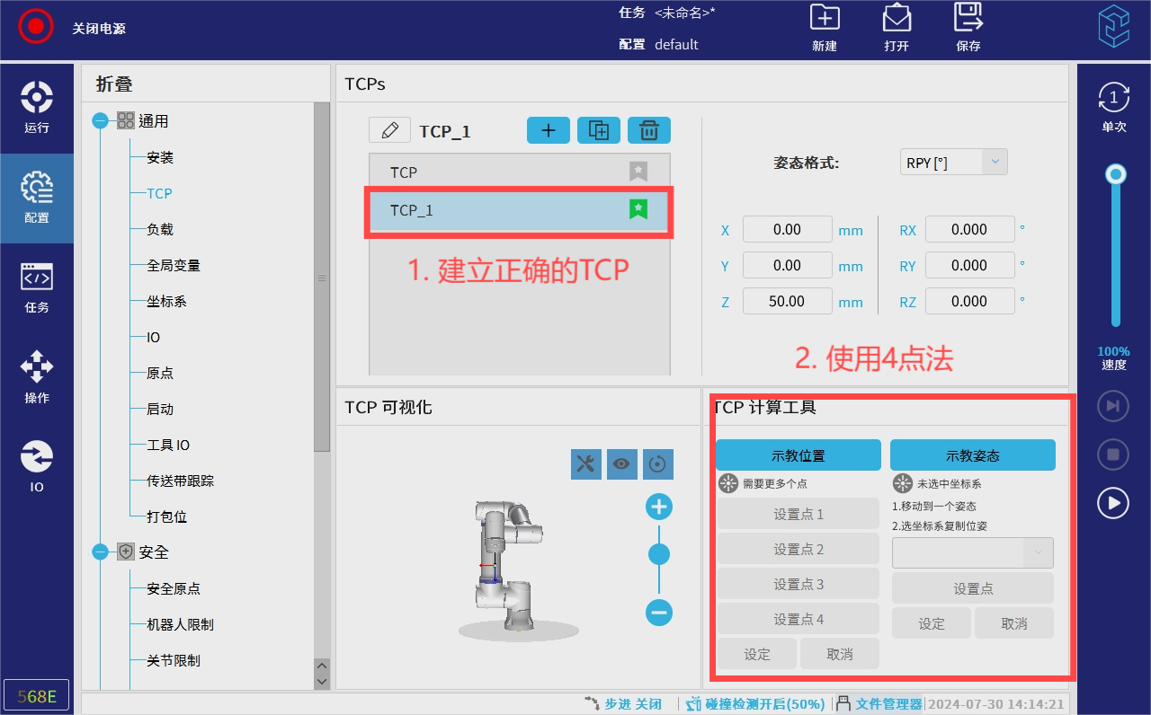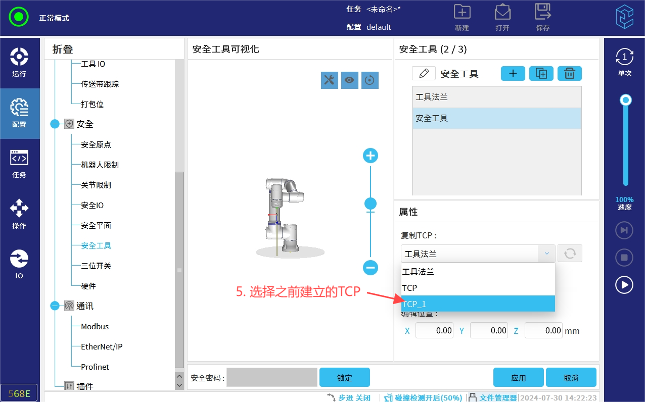 1. 我们在创建安全工具之前首先要建立好正确的TCP工具中心点,在配置-----TCP中创建新的tcp。如下图: