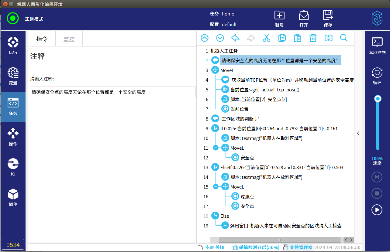 4.  考虑到正在取料/放料的时候直接回安全位,可能会碰到料盘,治具等机器人接触之类的物品,所以在获取当前位置后直线上升到一个安全高度,不建议使用偏移Z+方向的方式抬高的方式,因为有可能在手动移动后,机器人已经在一个比较危险的高度,再次抬高可能会碰到上方物品,应该把安全点的高度赋值给当前位置的Z方向(根据现场实际情况选择直接赋值安全点的高度还是赋值一个固定的高度),运行后机器人会在原地上升或下降到一个安全高度,这样更安全。