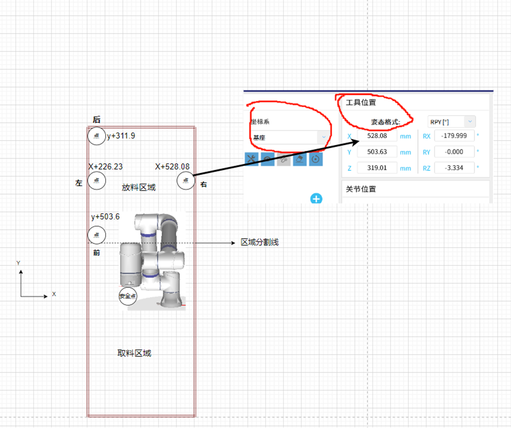 2.需要手动移机器人取料区域最左端(+X方向)点,最右端(-X方向)点,最后端(+Y方向)点,最前端(-Y方向)点,记住这四个点的x,y最大值和最小值程序判断区域时需要用到,移哪个方向看哪个方向的值,如图2-2。