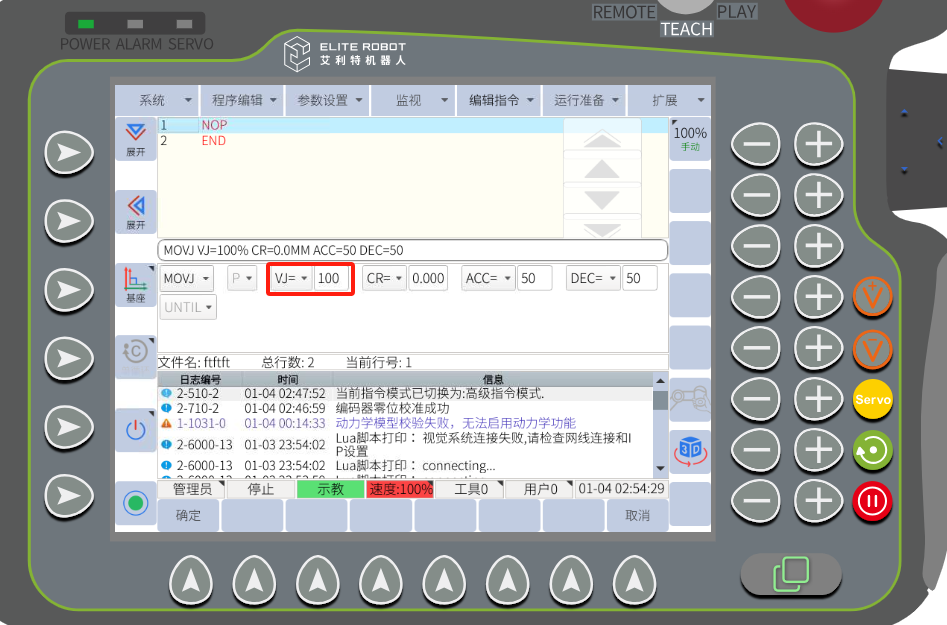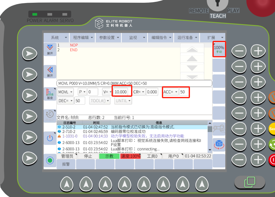 (2):提高机械手运动指令的速度,加速度,整体运行倍率 建议最大速度: