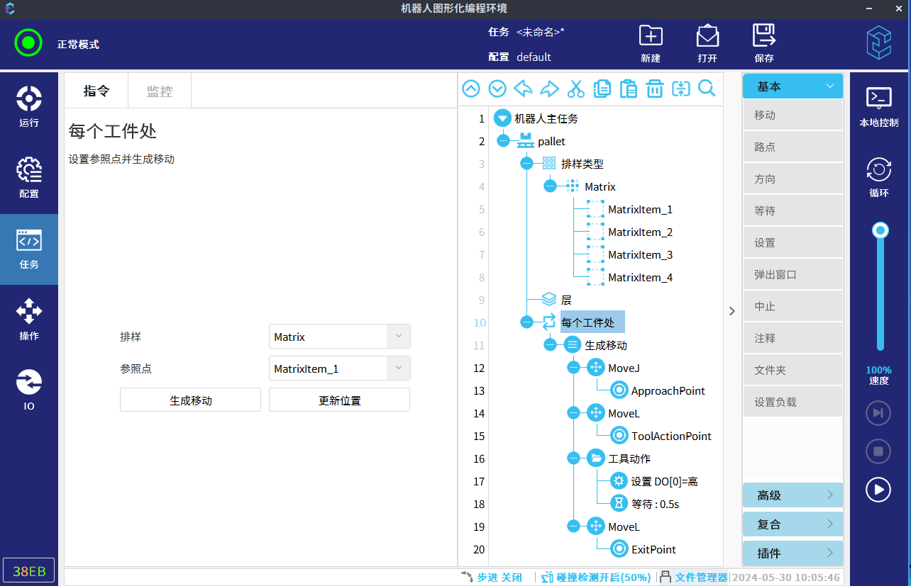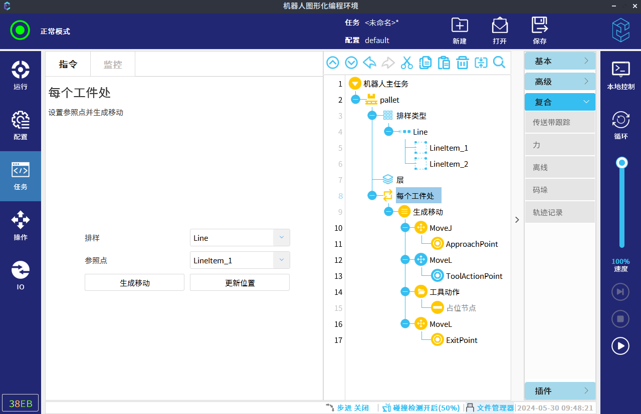 在“生成移动”节点下,设置接近点、工具动作点、工具动作以及离开点。设置完成后,工具将对每个工件重复这些动作。