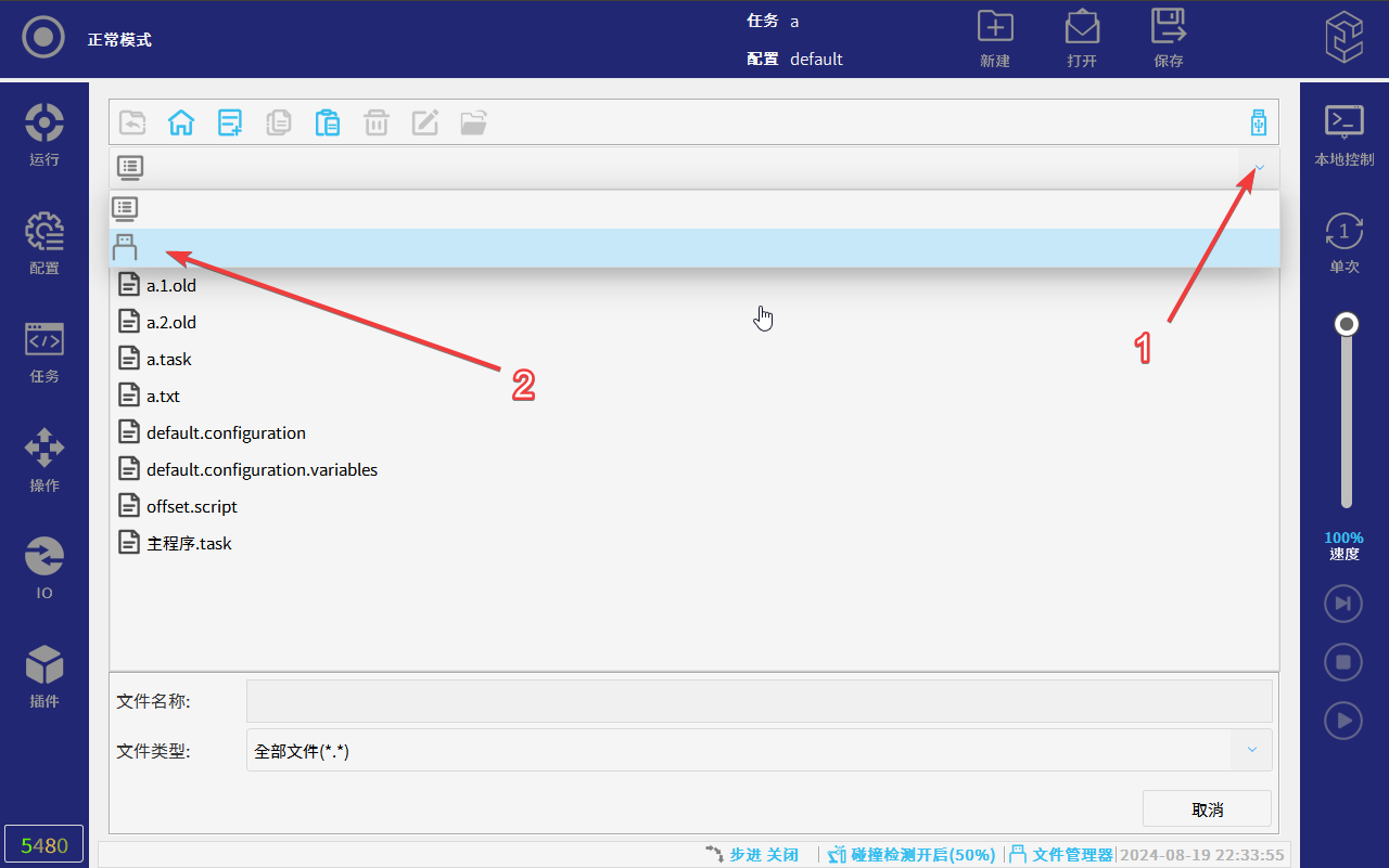 CS机器人示教器软件界面下方内置有文件管理器功能,该功能可以管理程序文件、配置(全局变量)文件和脚本等内部文件,以及可以管理外部存储介质U盘文件;