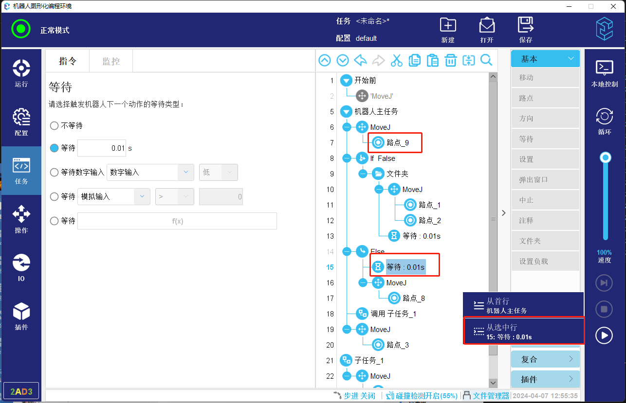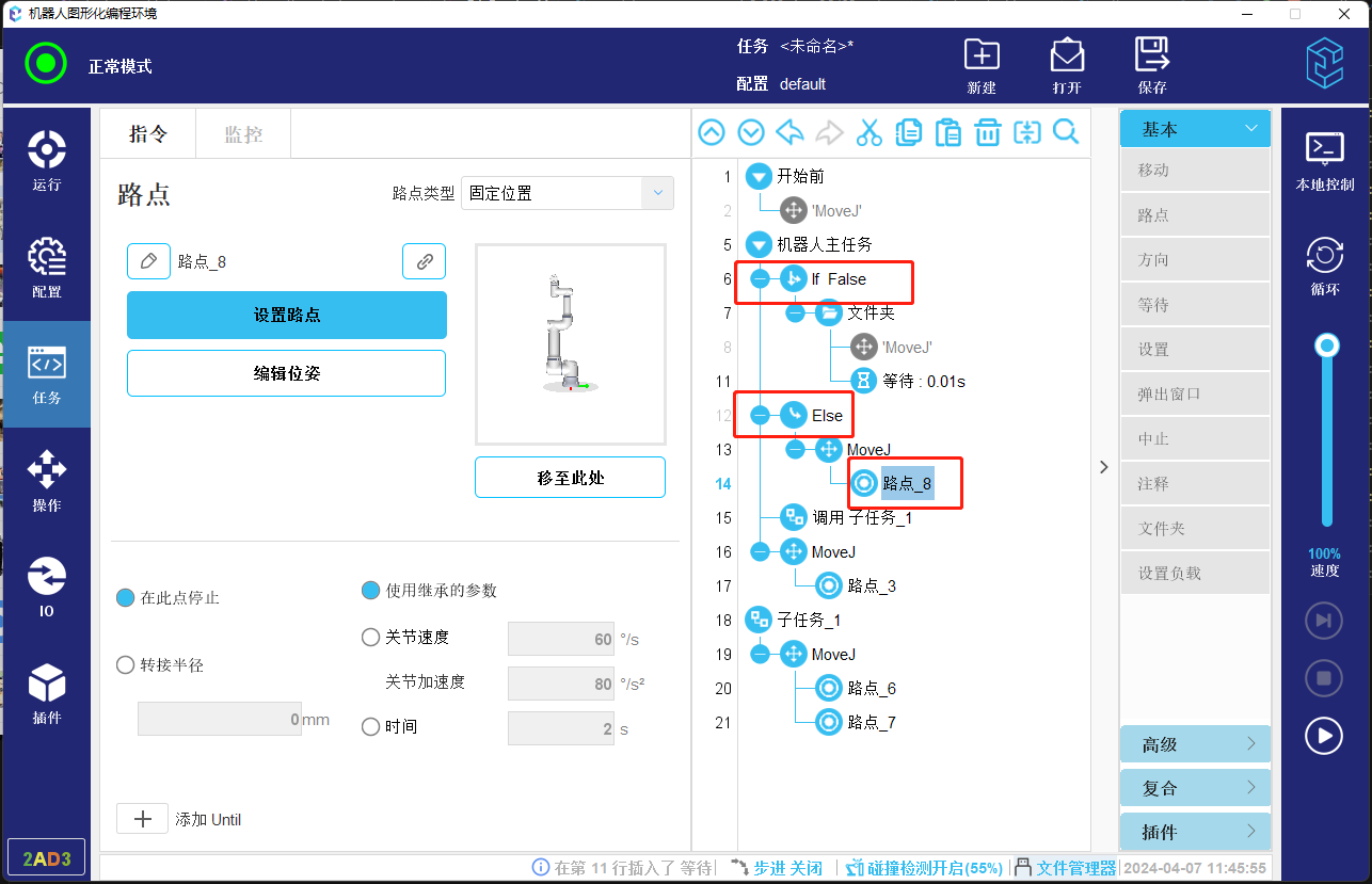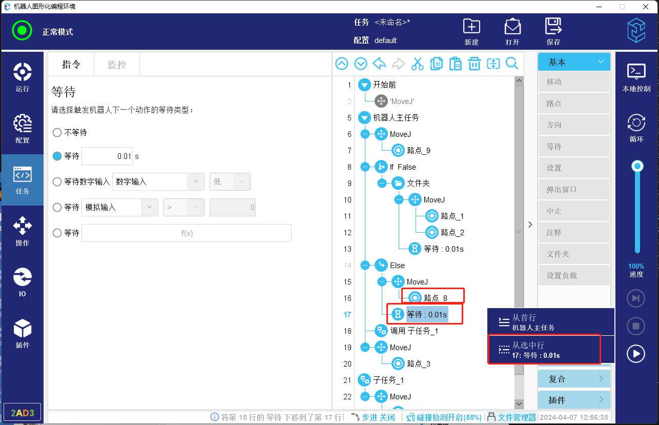 4. 如果当前选中的任务节点上方无可以运行到的节点并且内部也没有可以运行到的点,则会直接开始运行,不再继续向后考虑支持运行到的路点。所以下方图-13所示程序会支持开始运行,不会已路点_4作为起始位置。