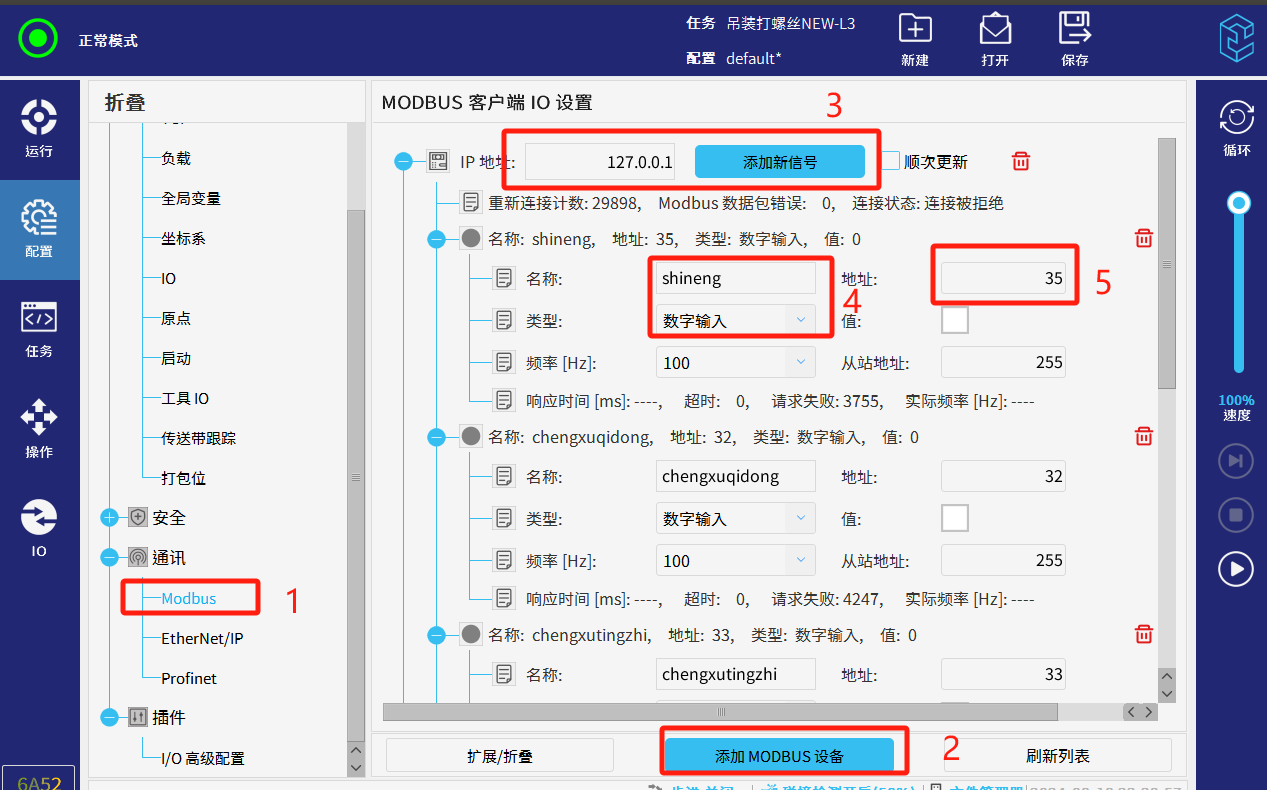 点击机器人示教器配置--通讯--modbus--添加modbus设备,输入ip(127.0.0.1属于机器人内部mudbus从站内部地址)