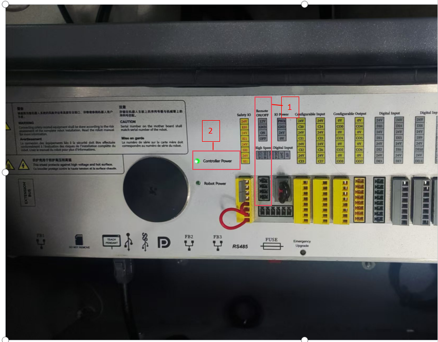 第二步:找到机器人控制柜远程开关机端口,即图-1第一处红框标记处
