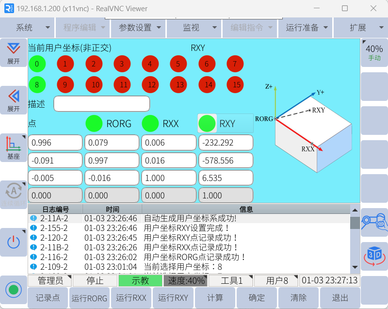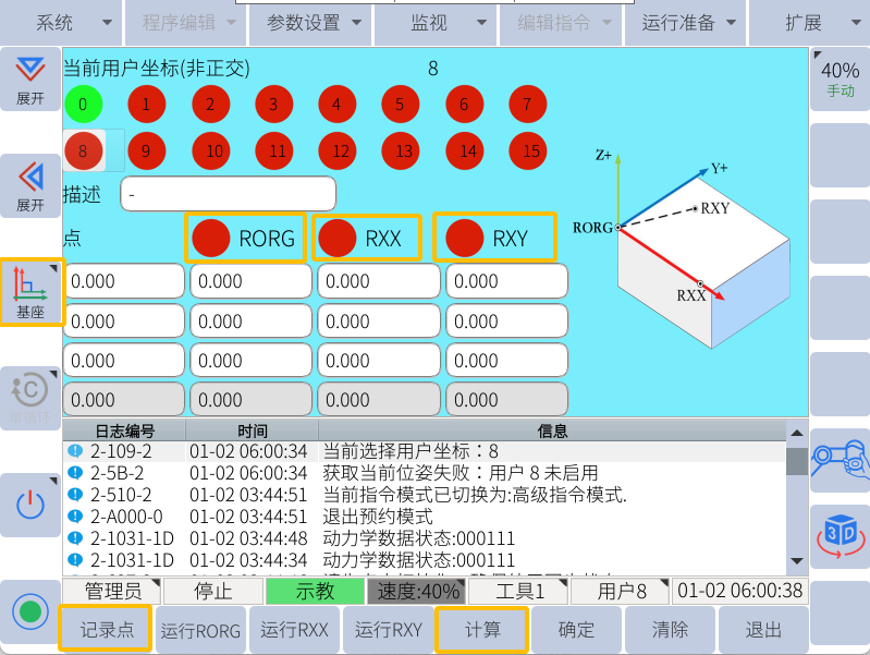2. 例如选择0号坐标系>>示教三个点,RORG对应X和Y方向原点,RXX对应X+方向,RXY对应Y+区域,正交坐标系的RXY是不需要基于原点在Y+方向精准示教,只需要在Y+区域内任意点即可,机器人通过X+方向轴根据90°夹爪算出Y+和Z+方向。