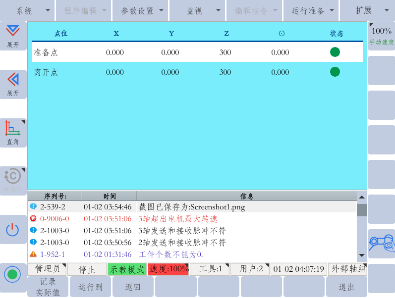 8. 辅助点分为准备点和离开点,就是我们一般所说的放料位上方位。只需要设置好Z方向的参数。设置好后,会自己计算出垛点的上方位,进行偏移运动。以毫米为单位。