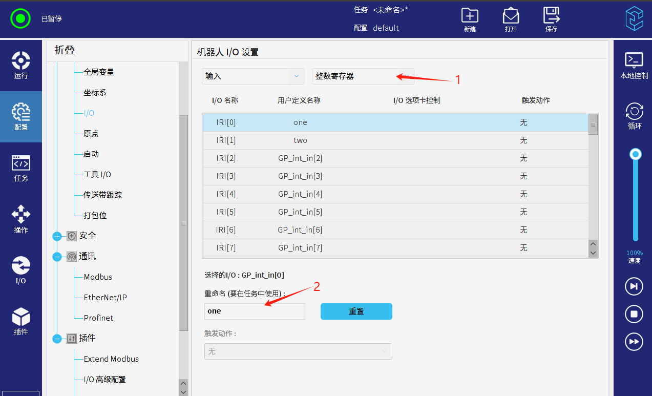 项目通常会需要通过modbus通讯来让PLC控制机器人的启动和暂停,还有反馈 机器人的运行,暂停状态等。但是目前通过modbus来实现必须牺牲一个IO,MODBUS扩展插件可规避占用物理IO。