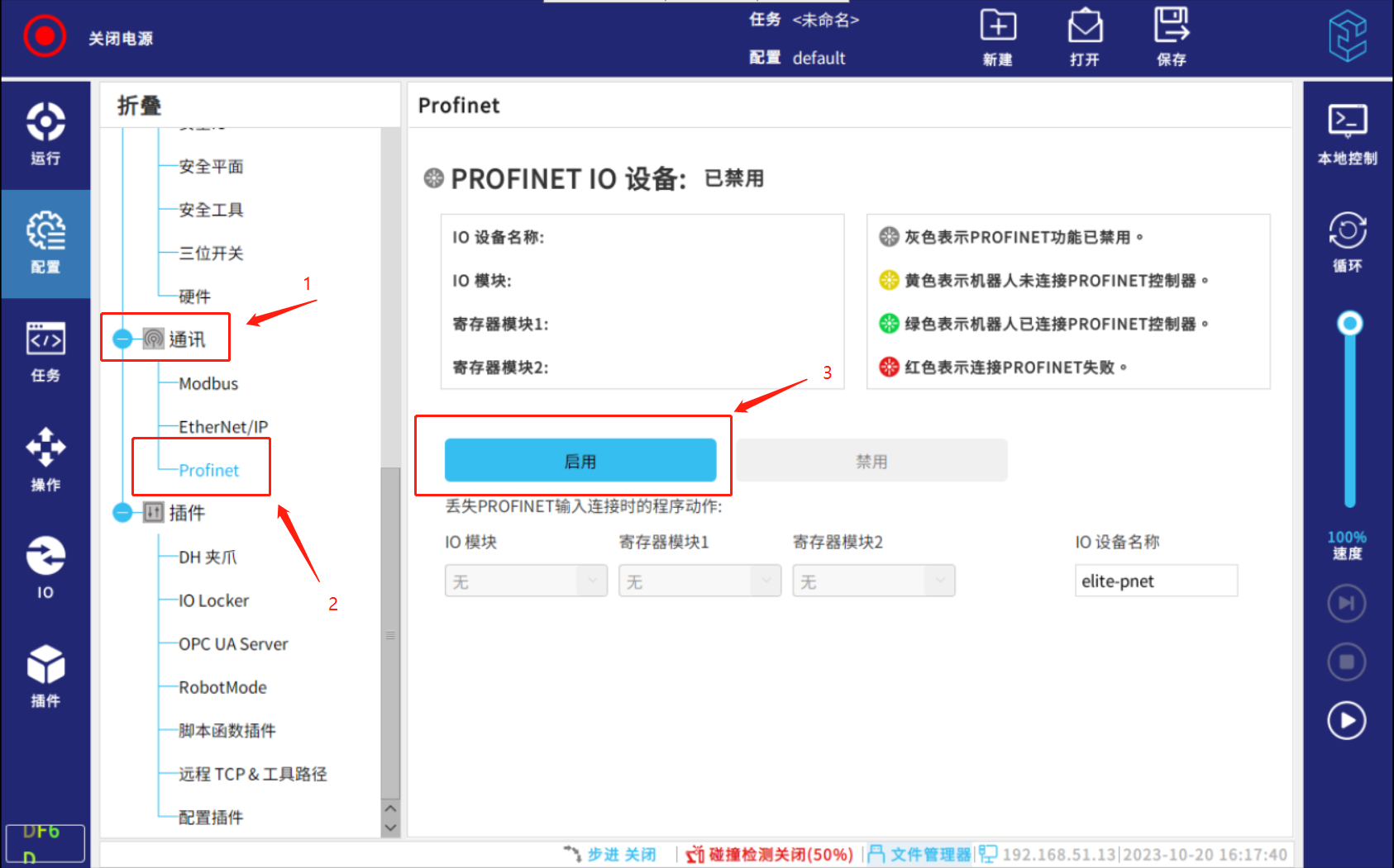 将机器人 FB1 网口接入PLC交换机,点击“配置> 通讯> Profinet”,进入 Profinet 界面,启用 Profinet 功能。如下图所示: