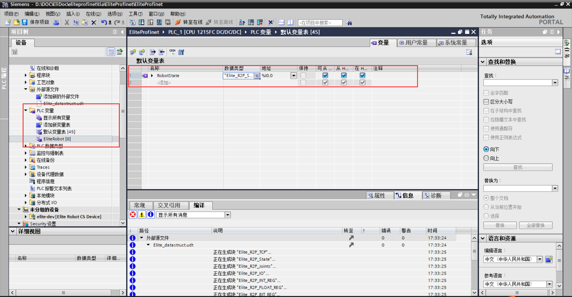 对于 PLC S7-1200 和 S7-1500 (PLC 固件 4.0 或更高版本):Elite_datastruct.udt