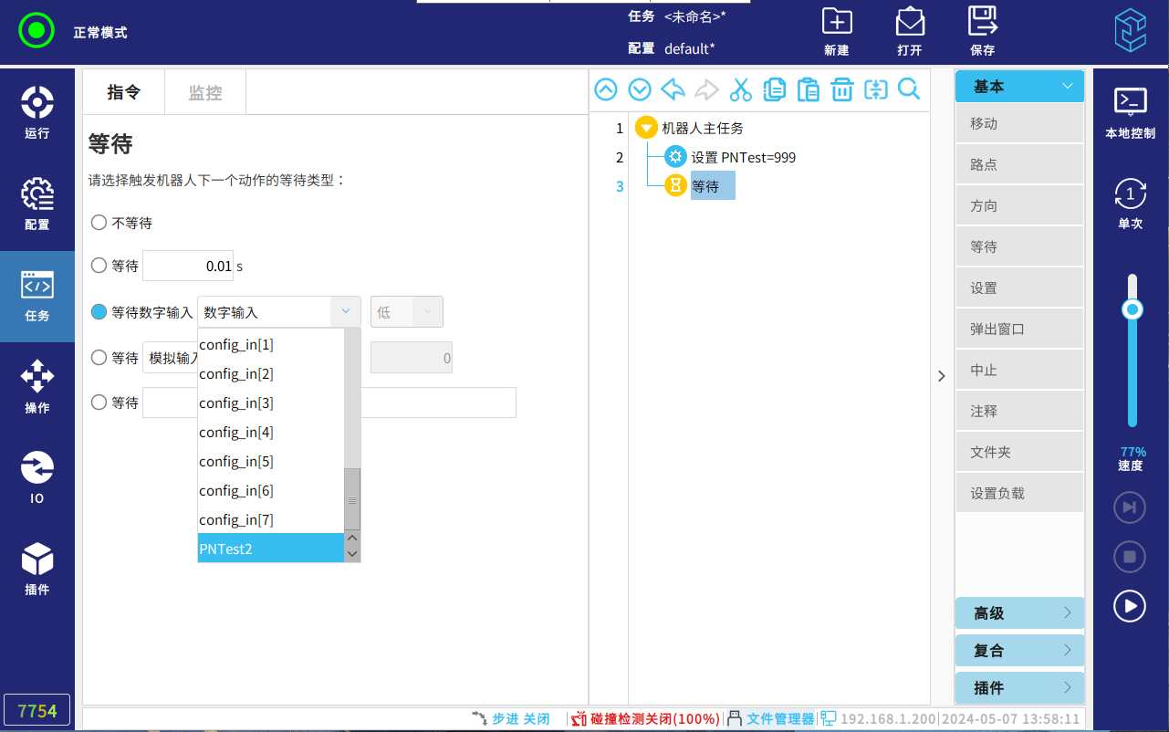 若要等待浮点寄存器或者整数寄存器为指定数值则需使用函数,如下图选择等待,下拉input快捷栏找到定义好的浮点/整数寄存器: