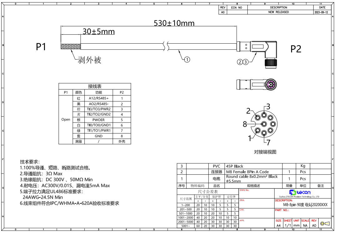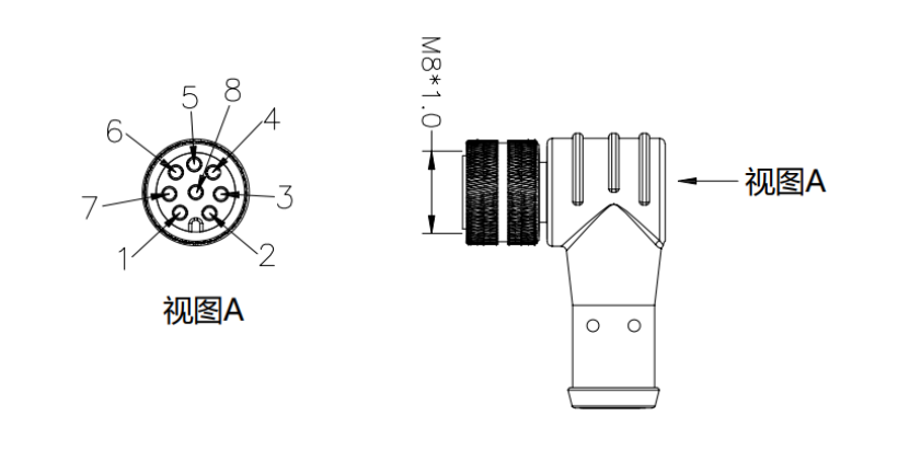 如果是用米兰·(milan)中国提供的8芯弯头成型线,【物料号NA20300180】如图;则针脚编号、线序颜色为固定排序。