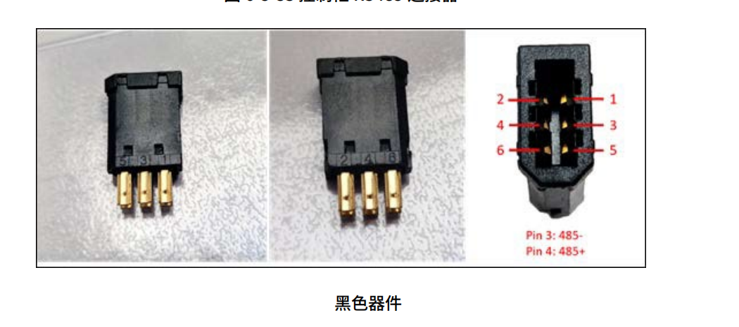 黑色塑料装置的正反面分别标有 PIN“1 3 5”和“2 4 6”。PIN3 应焊接到 485-,PIN4 应焊接到 RS485+。该接口支持的最大波特率为 500Kbps。