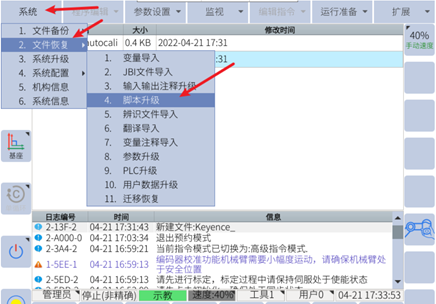 ● 存放好LUA脚本文件后插入机器人的电控柜USB口点击系统->文件恢复(U盘到本地)->脚本升级。