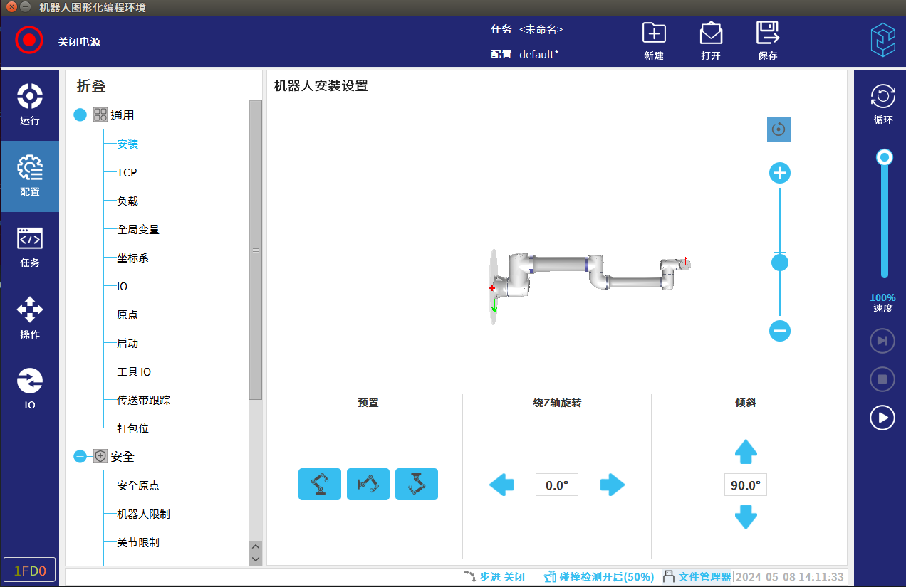 在CS机器人中有很多常用参数需要我们去进行配置,比如安装方式,IP地址的设置,新建TCP,负载的设定,全局变量的设置,坐标系的建立,原点的设定,启动的设定,如何回打包位等等一些常用参数的配置。