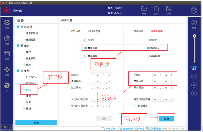 3.1设置IP时在使用机器人FB2网口时可能会出现FB网口始终处于未连接状态,这时就需要重启一下示教器。
