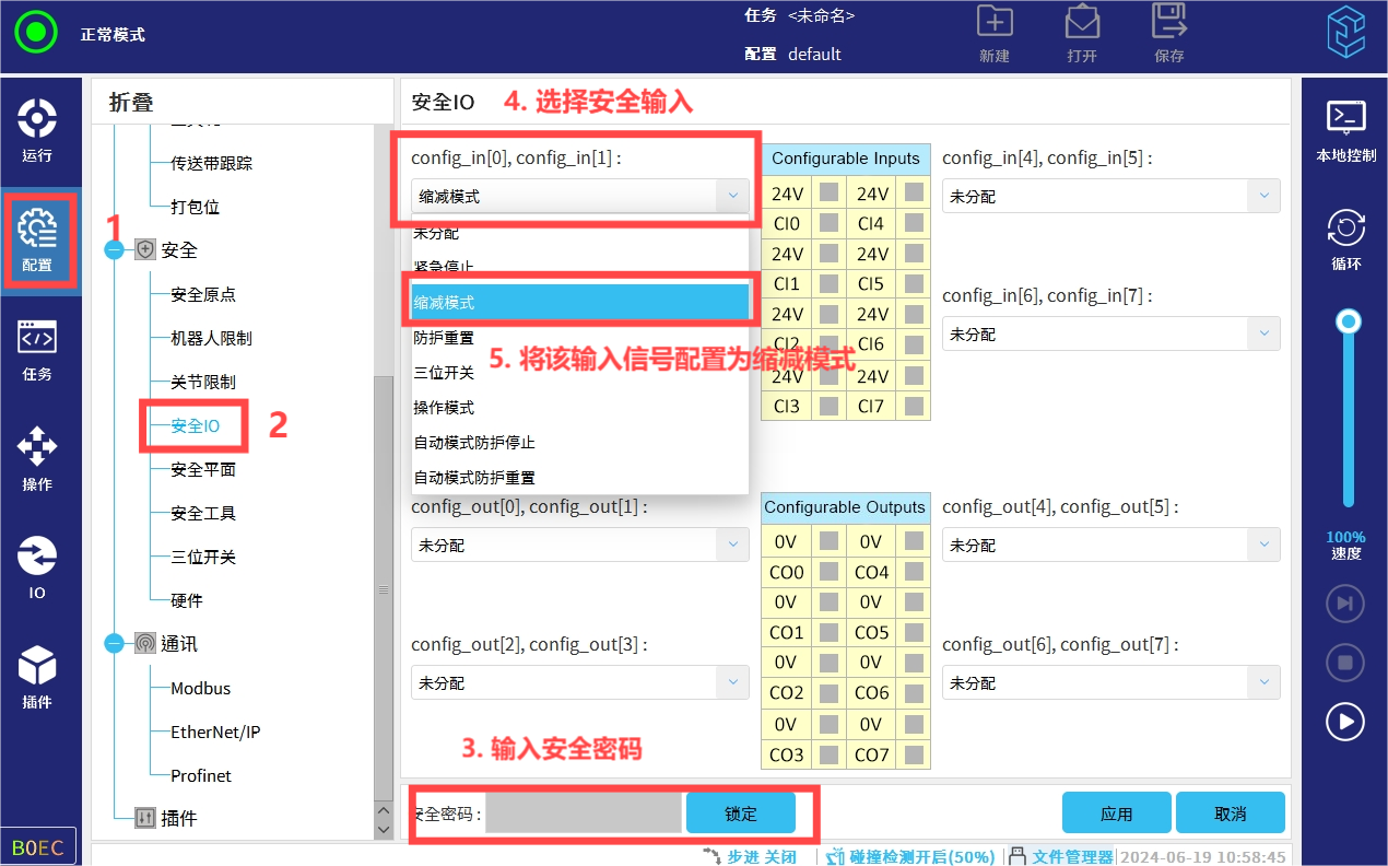 缩减模式的应用场景二是在安全IO功能配置界面的安全输入/输出选项中,可以选择配置缩减模式信号,以实现不同的功能。
