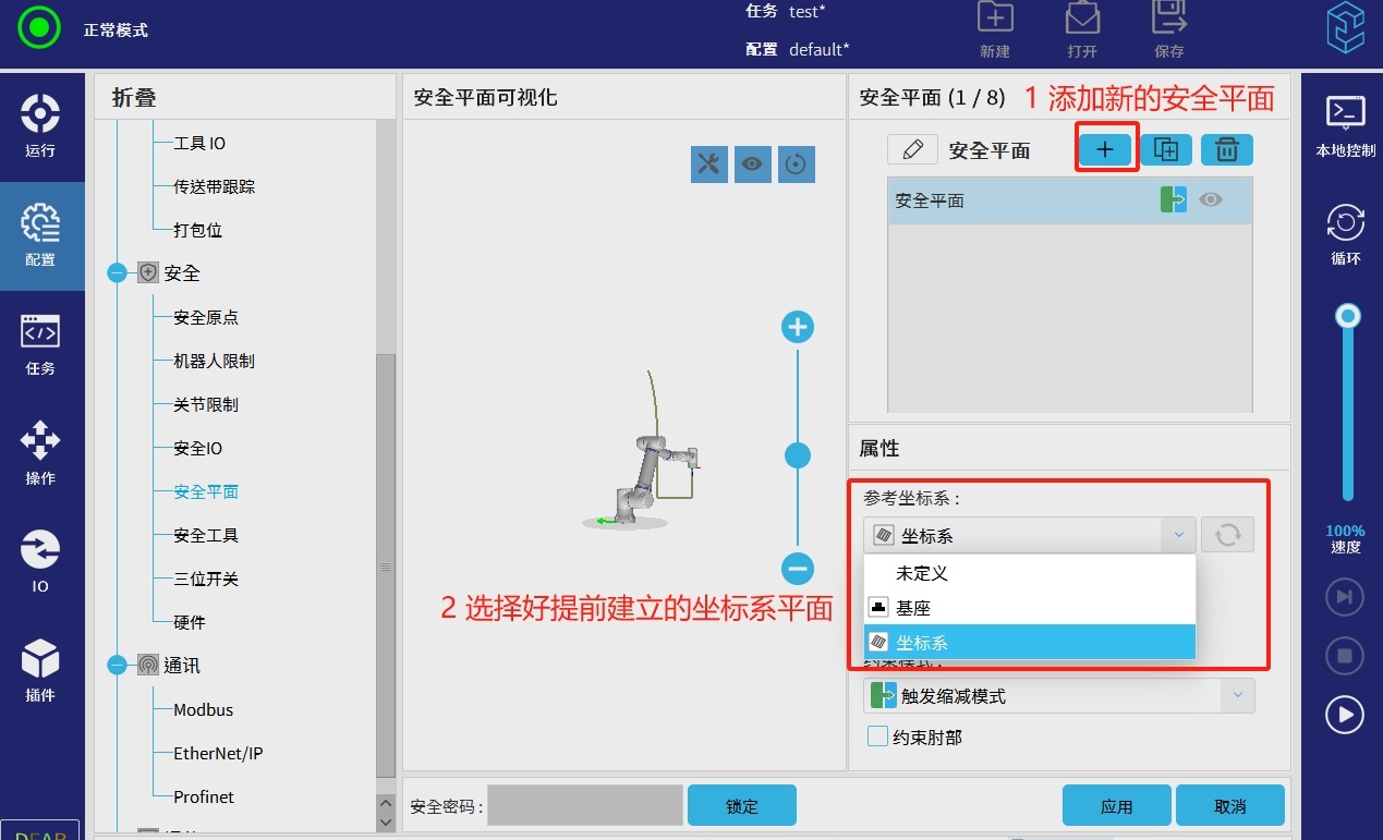 4. 选择好之前建立的坐标系或者基坐标系,通过位置偏移来确定平面位置,该位置偏移是通过增加或者减小该坐标系的Z轴坐标来实现平面位置的偏移。该平面的Z+方向是正常区域,Z-方向是限制区域,机械臂工具中心点到达该平面及该平面Z-方向区域会触发相应的约束模式,缩减模式或者防护停止。如果机械臂进入防护停止,会自动进入安全恢复模式,手动把机械臂的工具中心点移动到Z+方向上面,机械臂才能再次正常使用。
